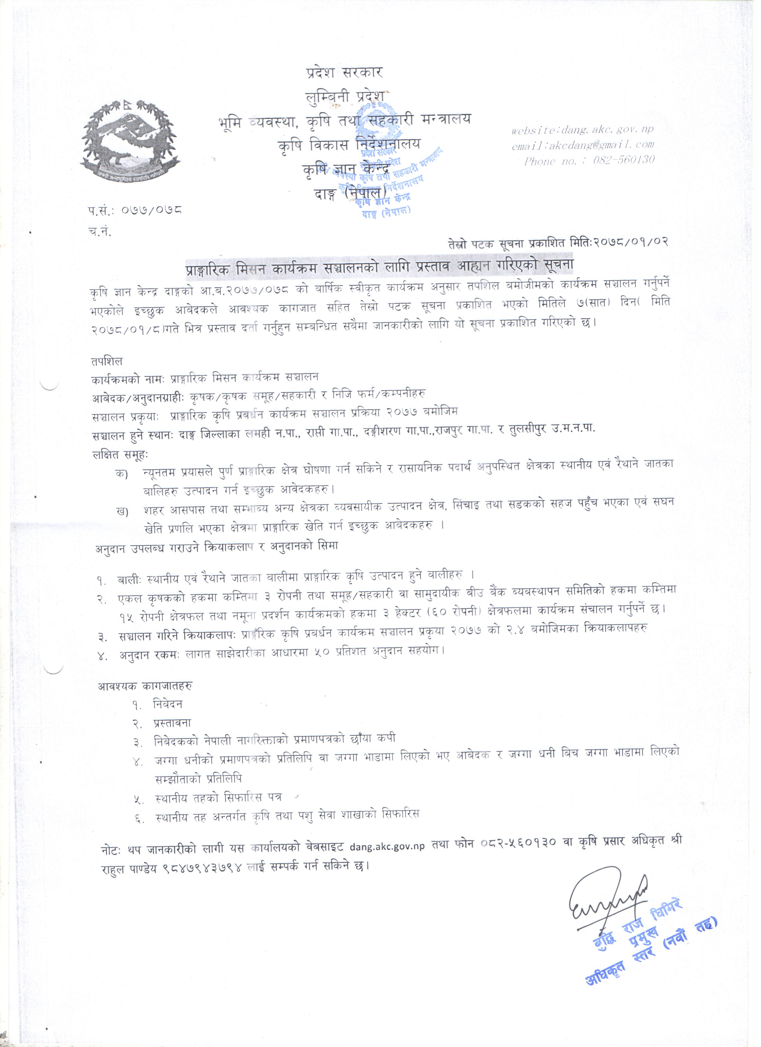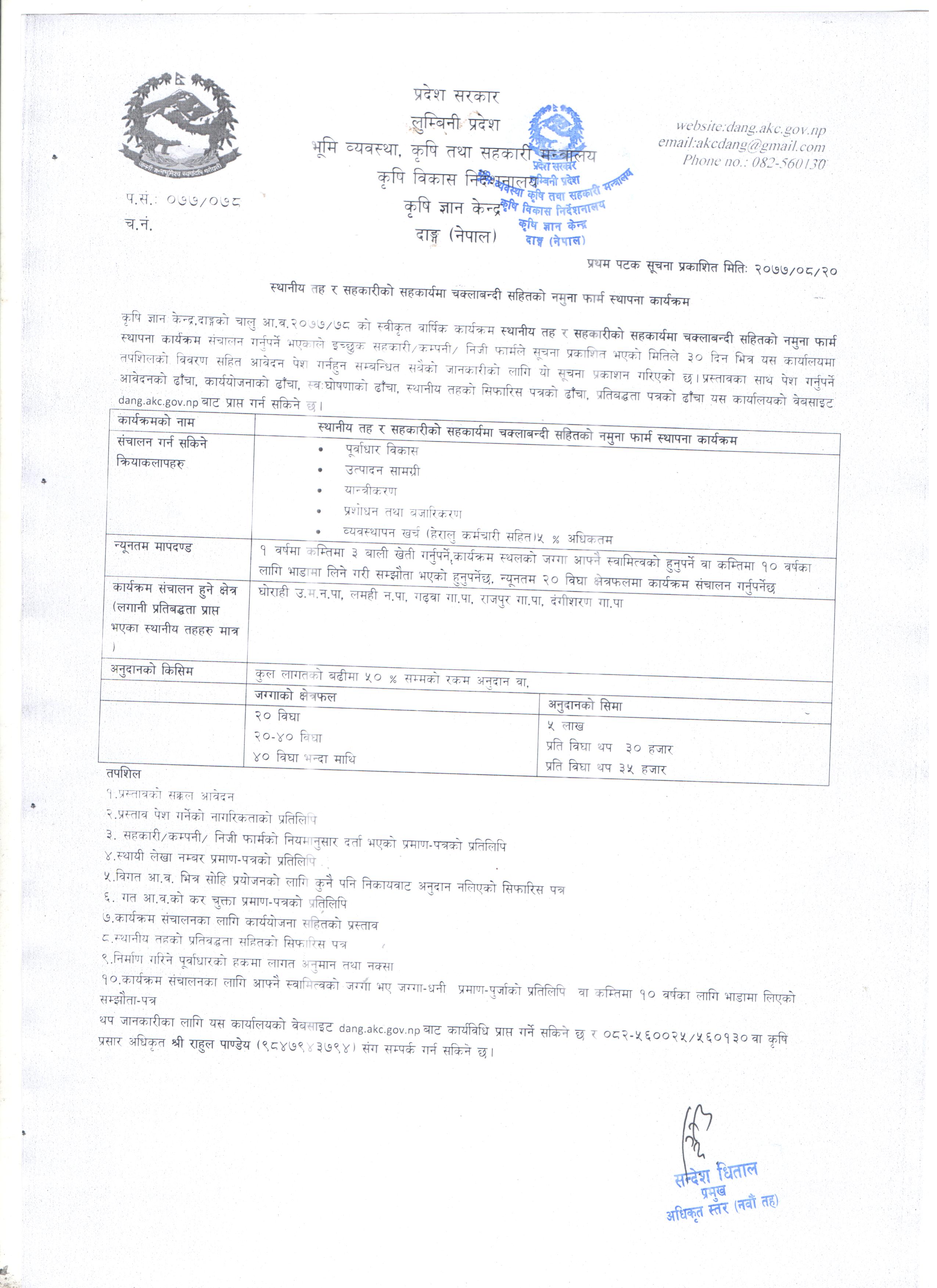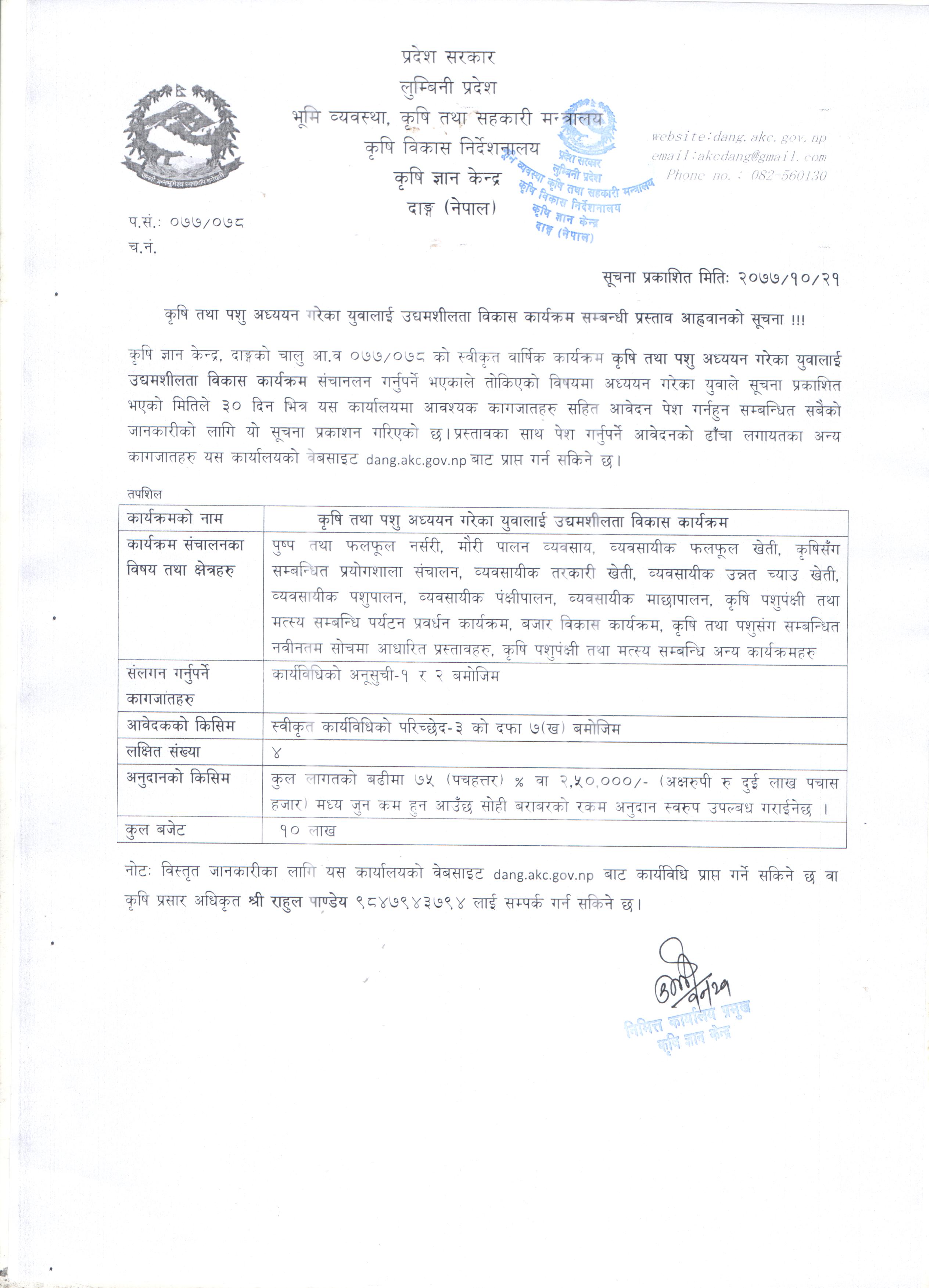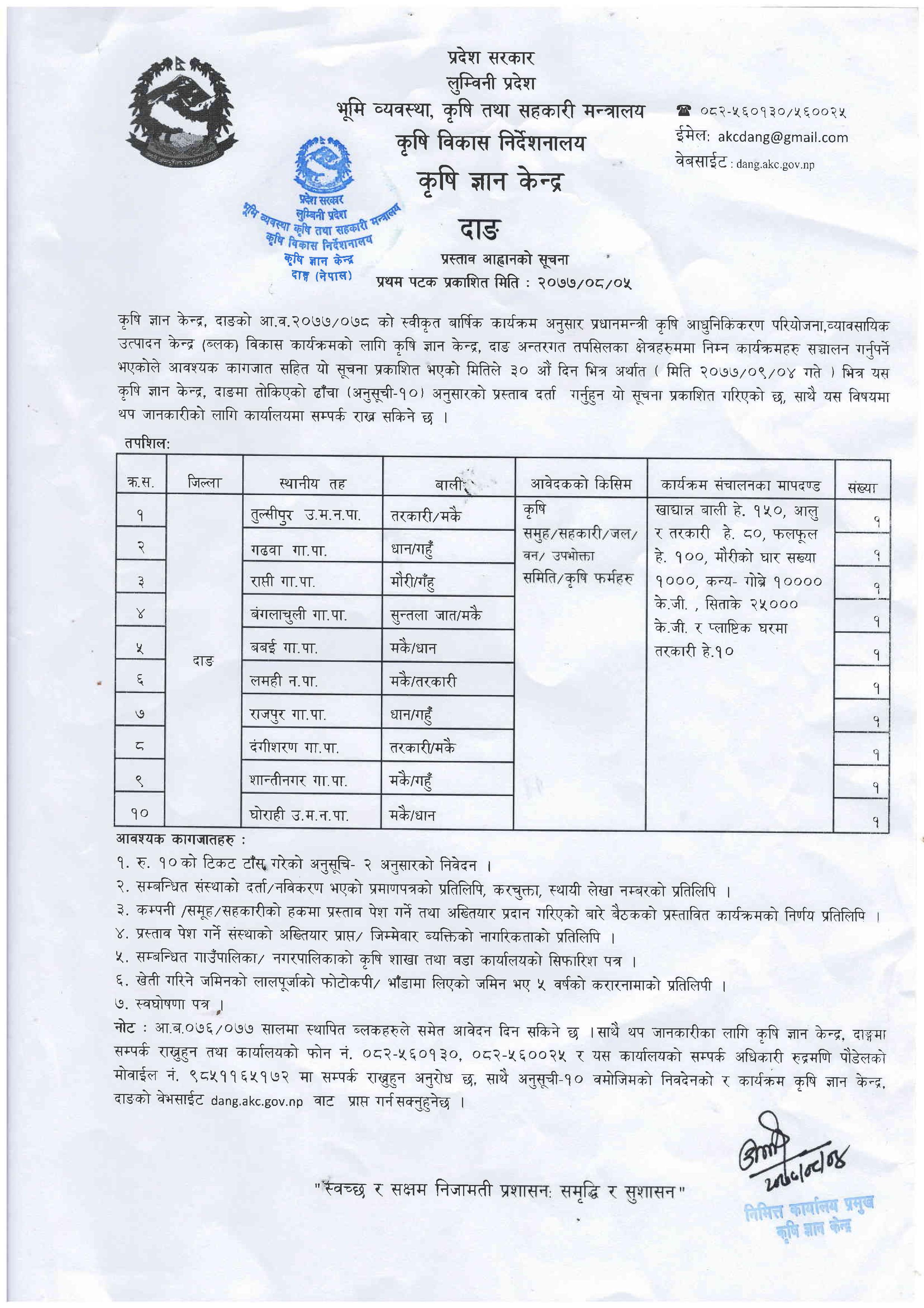 पुष्प उत्पादन तथा प्रवर्द्धन कार्यक्रम, केरा प्रवर्द्धन कार्यक्रम, मौरी प्रवर्द्धन कार्यक्रम र कृषि उपज भण्डारणका लागि कोल्ड च्याम्बर स्थापनाका लागि प्रस्ताव आह्यवन सम्बन्धि सूचना |