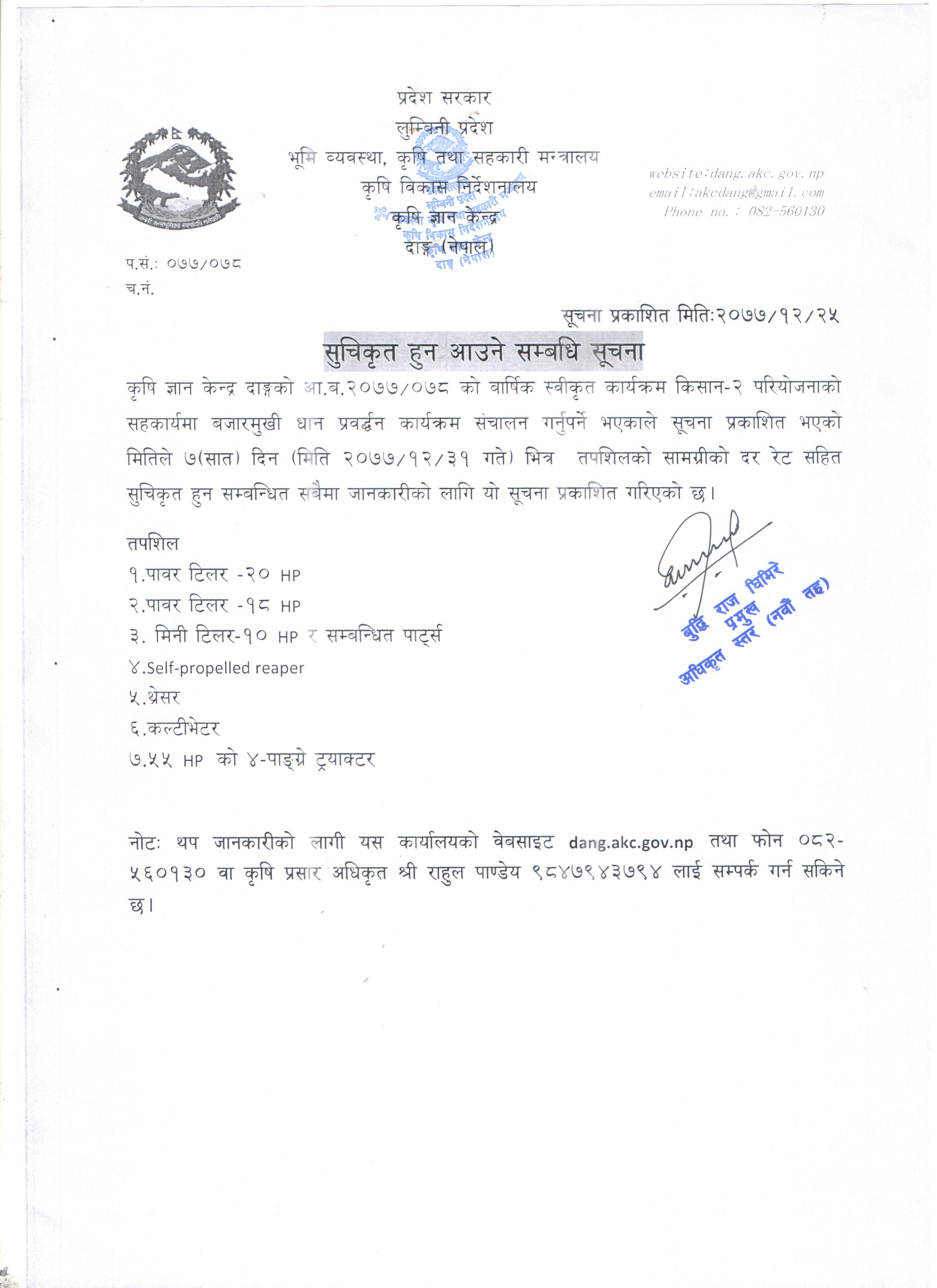 मसिना तथा वास्नादार धान प्रवर्द्धन र सार्बजनिक निजि साझेदारिमा सहिद द्वन्द पिडित पुर्व जनमुक्ति सेना तथा लोकतान्त्रिक योद्धा परिवार र सुकुम्वासि समुदायका लागि कृषि उत्पादनमुलक कार्यक्रमको सूचना |