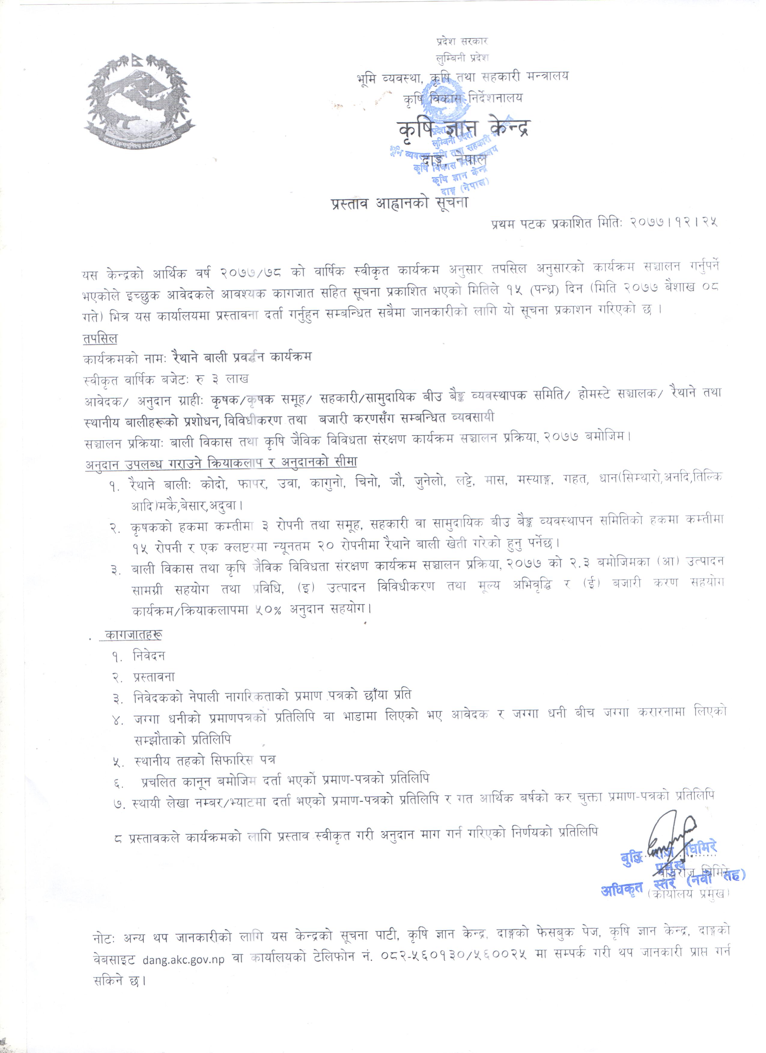 रैथाने बालीको प्रस्ताव आह्वाहन गरिएको सूचना |
