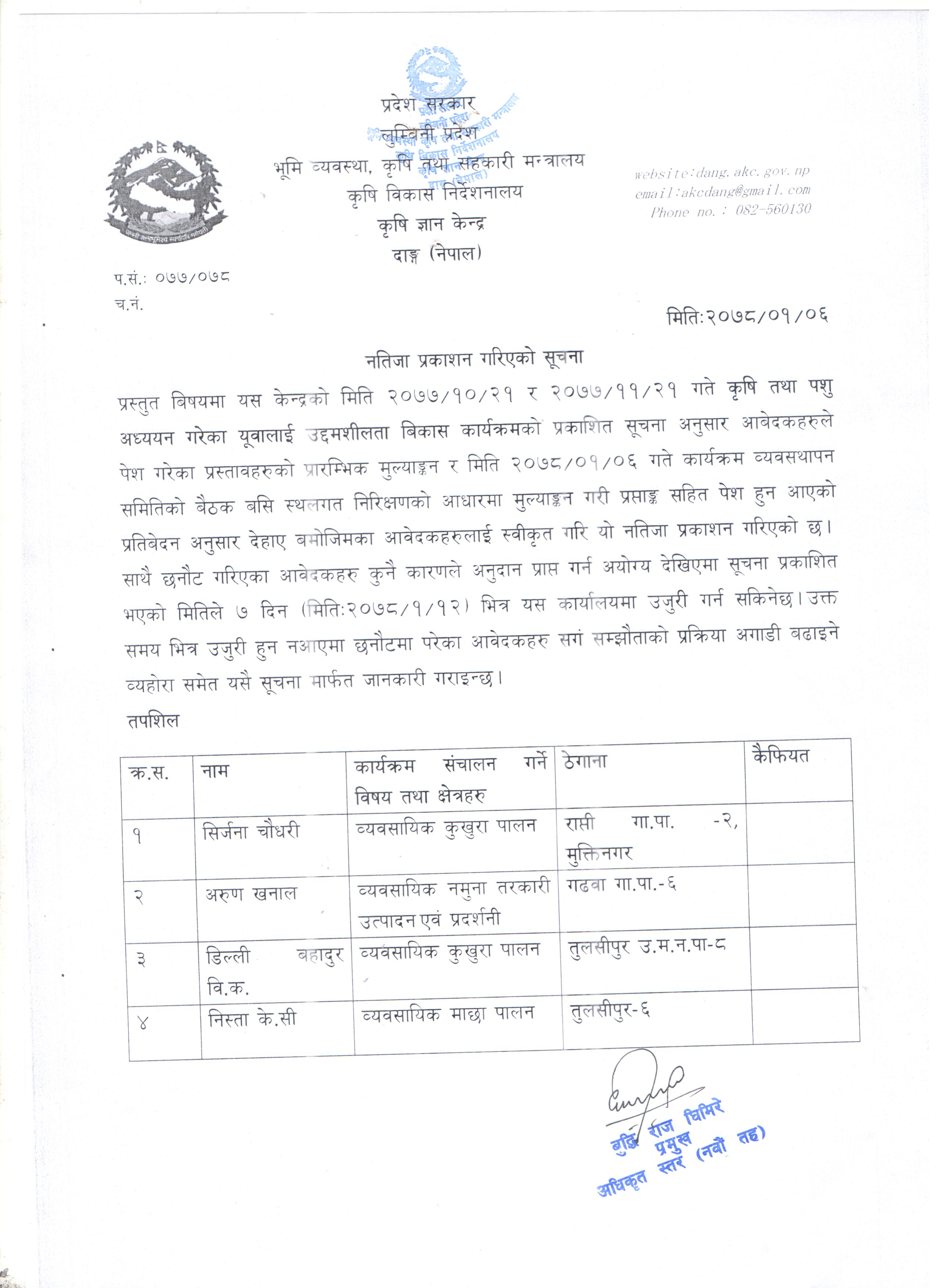 कृषि तथा पशु अध्ययन गरेका युवालाई उद्यमशीलता विकास कार्यक्रमको नतिजा प्रकाशन गरिएको बारे |