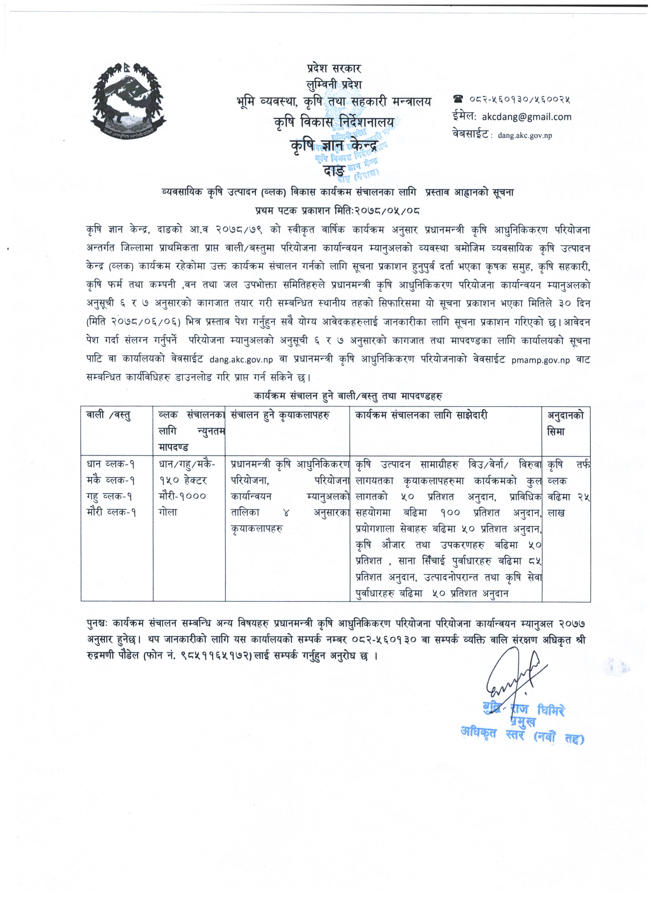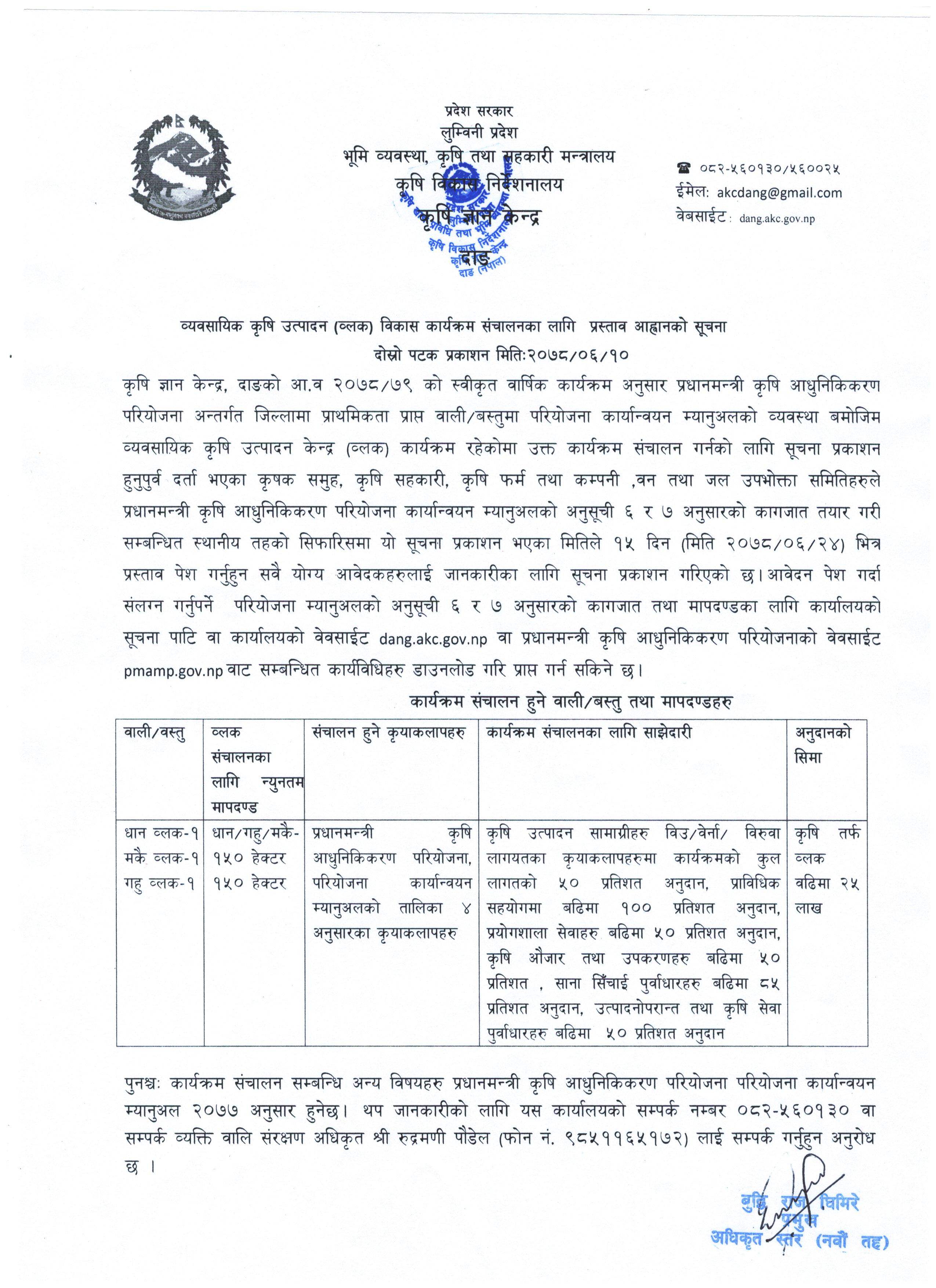 व्यावसायिक उत्पादन केन्द्र (ब्लक) विकास कार्यक्रमको सूचना आह्वान गरिएको बारे |