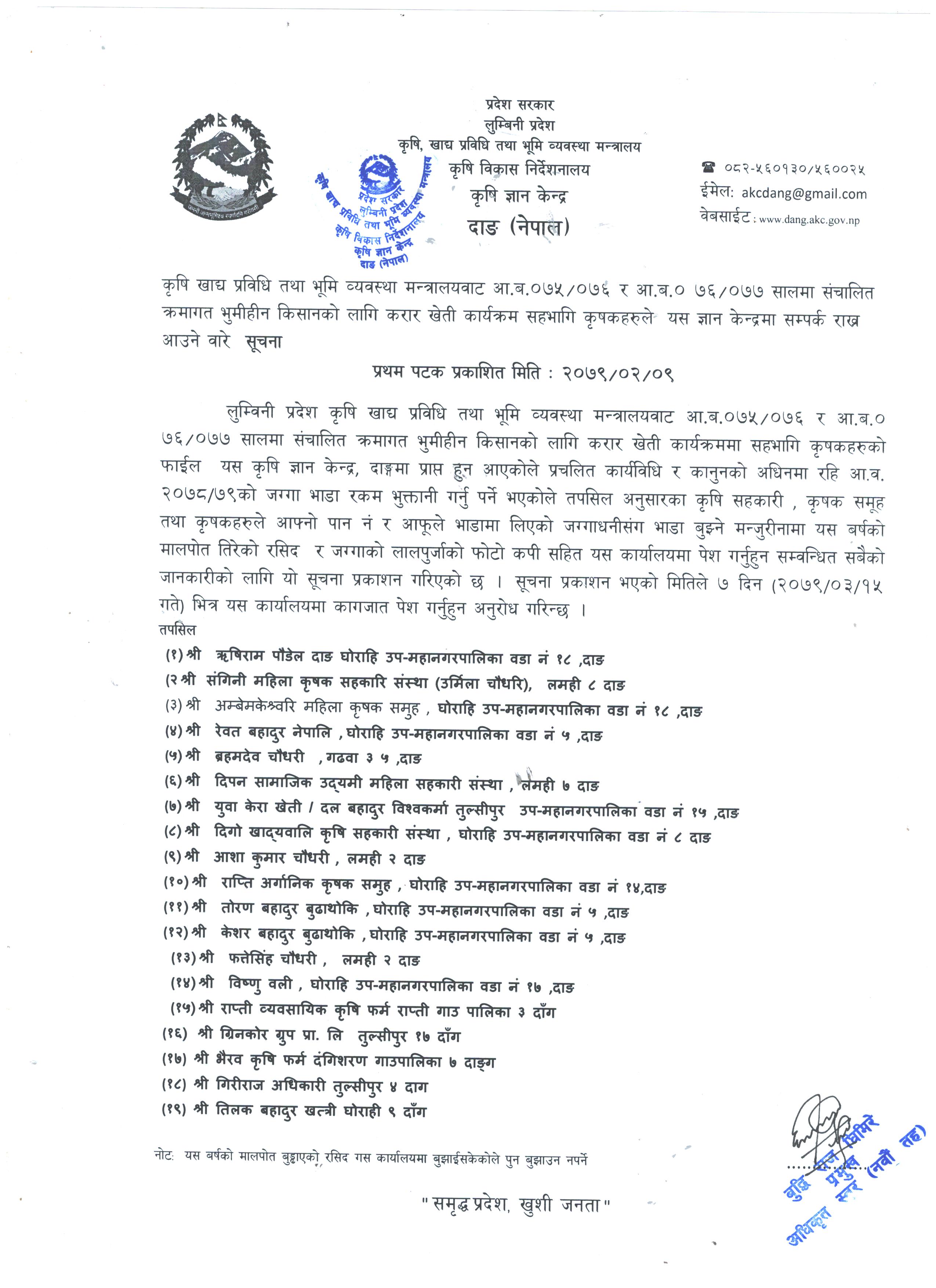 करार खेतिमा छनौट भएका प्रस्तावहरुको सूचना |
