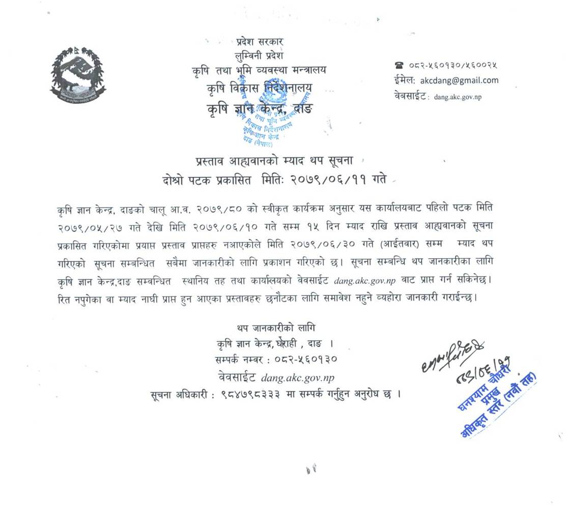 आ.व २०७९/८० को प्रस्ताव आह्वान म्याद थप सूचना (२०७९/०६/३० सम्म) |